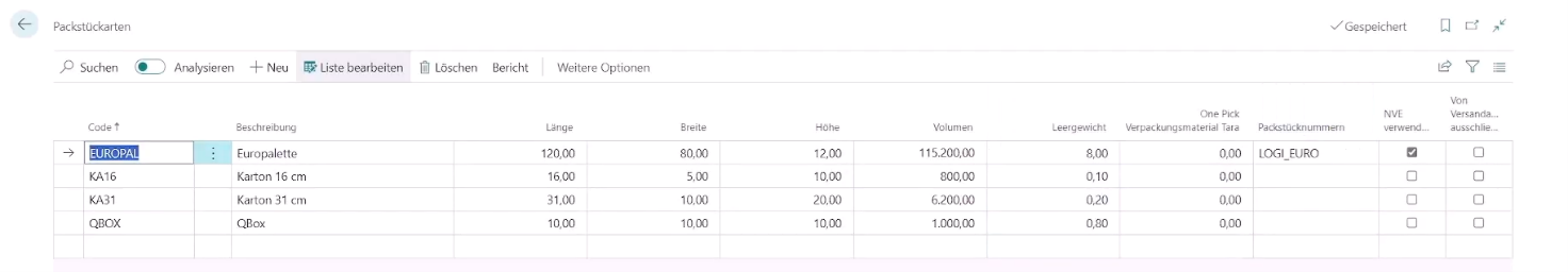 Rufen Sie die Liste "Packstückarten" über die Suche auf und ergänzen Sie Ihre Packstücke.