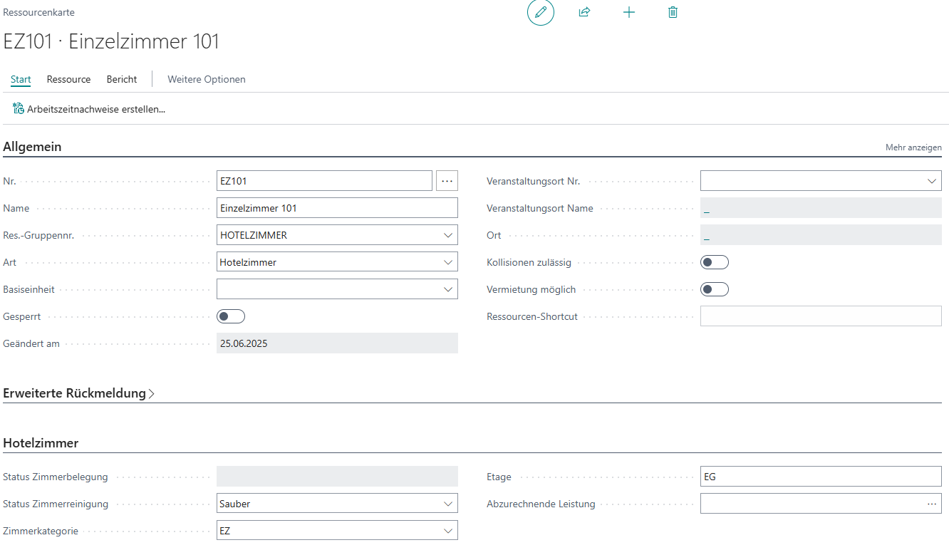 Register Hotelzimmer: Dieses Register ist nur sichtbar, wenn die Ressource vom Typ "Hotelzimmer" ist. Wechseln Sie zu diesem Register und ergänzen Sie relevante Informationen.